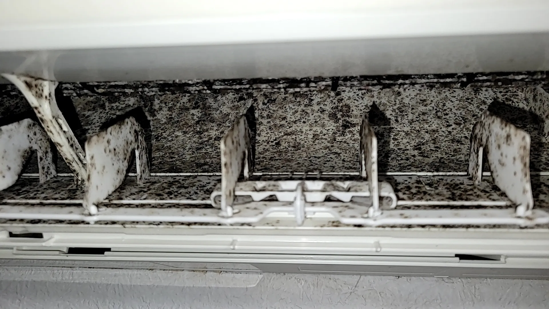 「部屋の温度は下がるけれどこのままでは視覚からのカビ汚れと嗅覚からの雑菌臭でテンションまで下がってしまうので」ということでしたのでいつも通りエアコン専用洗浄剤と強力に除菌もできるカビ取り洗浄剤のダブル洗浄で綺麗になりました。